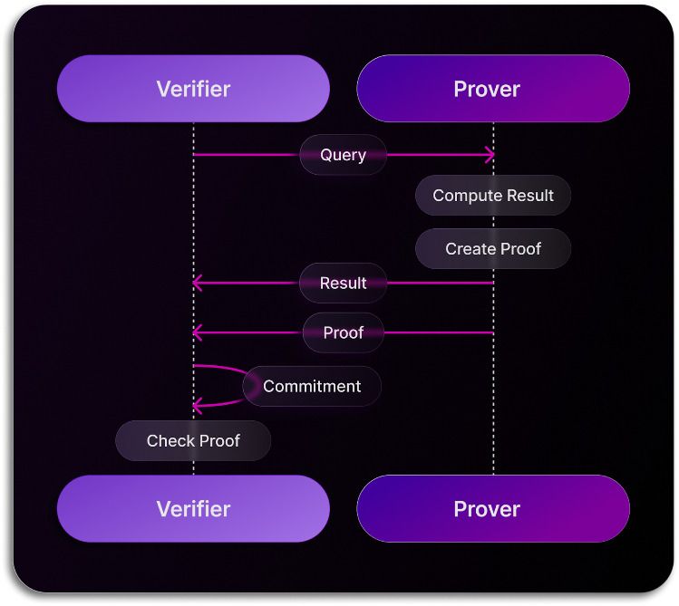 在 Proof of SQL 中有两个主要角色:客户端发送查询(验证者 Verifier),数据库服务计算结果(证明者 Prover)。虽然验证者通常发送查询,但它也可以是一个受信任的实体,比如智能合约。这对那些存储空间有限、但又需要确保数据分析正确执行且数据未被篡改的应用非常适用。