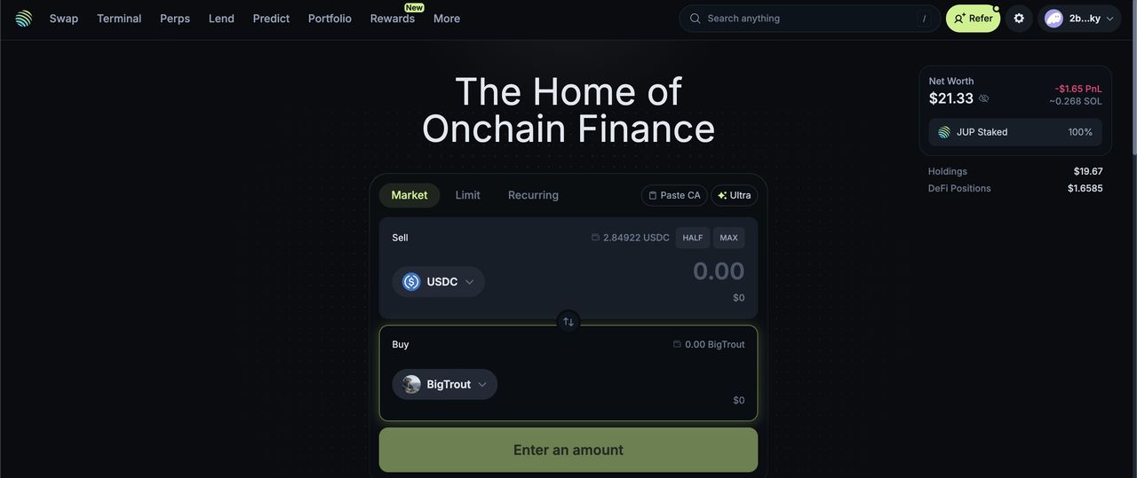 Jupiter 是在 Solana 上链上购买 BIGTROUT 的高效方式,因为它会自动在多个流动性池中为您的交易找到路由,以获得最佳可用价格和深度。