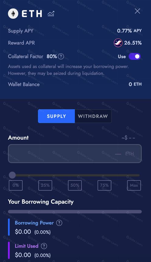 ZkLend目前支持StarkNet上的两个钱包Argent和Braavos,用户连接钱包后选择对应的资产池进行存款或借款操作即可。UI设计的相对简洁,在存款页面下方有抵押品选项,用户勾选的话就会以80%的抵押系数获得流动池中借贷资金,如果用户不勾选该项,则存入资金仅会被用于提供流动性。