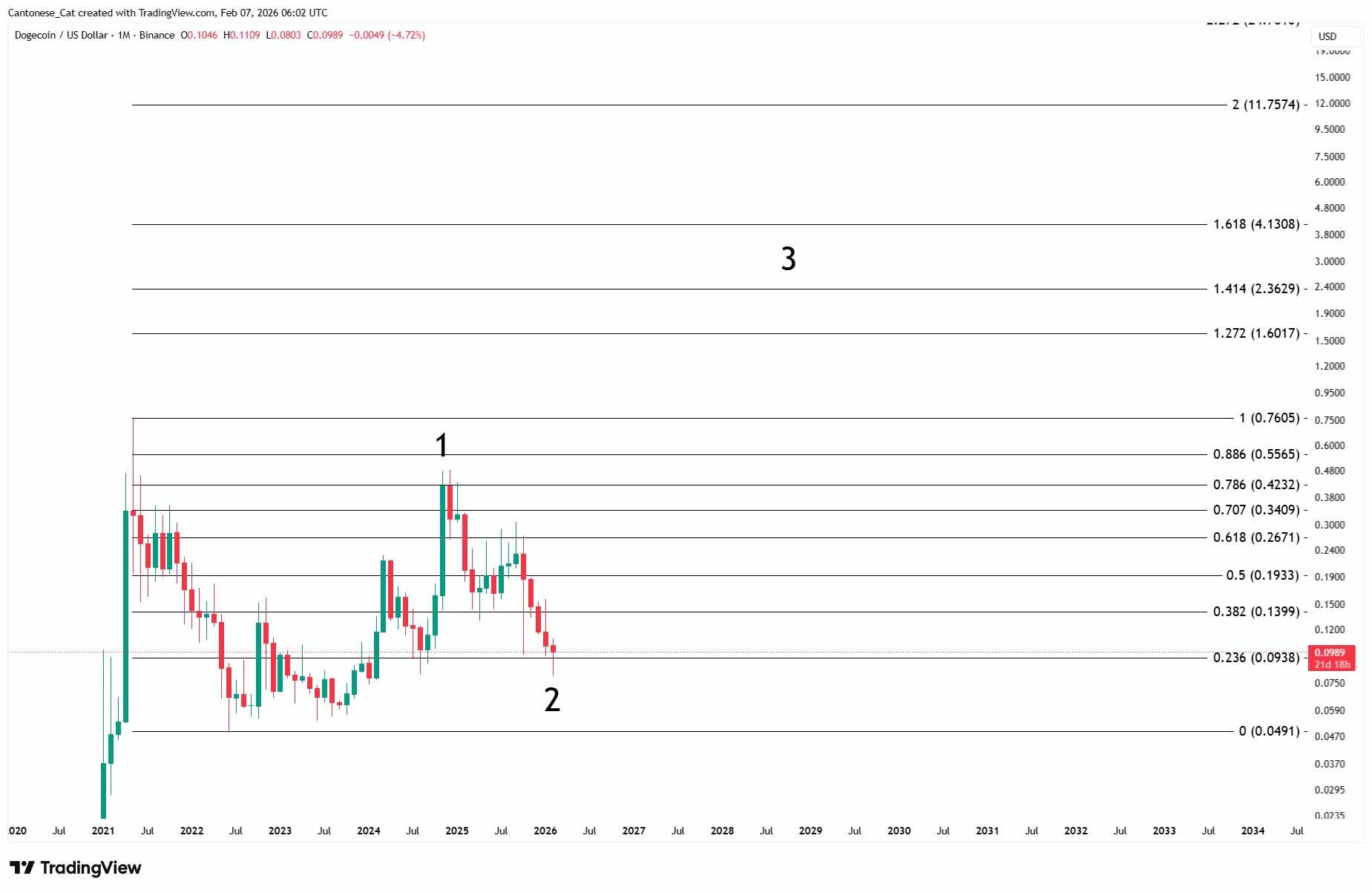 据广东猫(@cantonmeow)称,即使没有严格的艾略特 波浪理论框架,狗狗币的长期结构也与过去的扩张阶段相吻合。