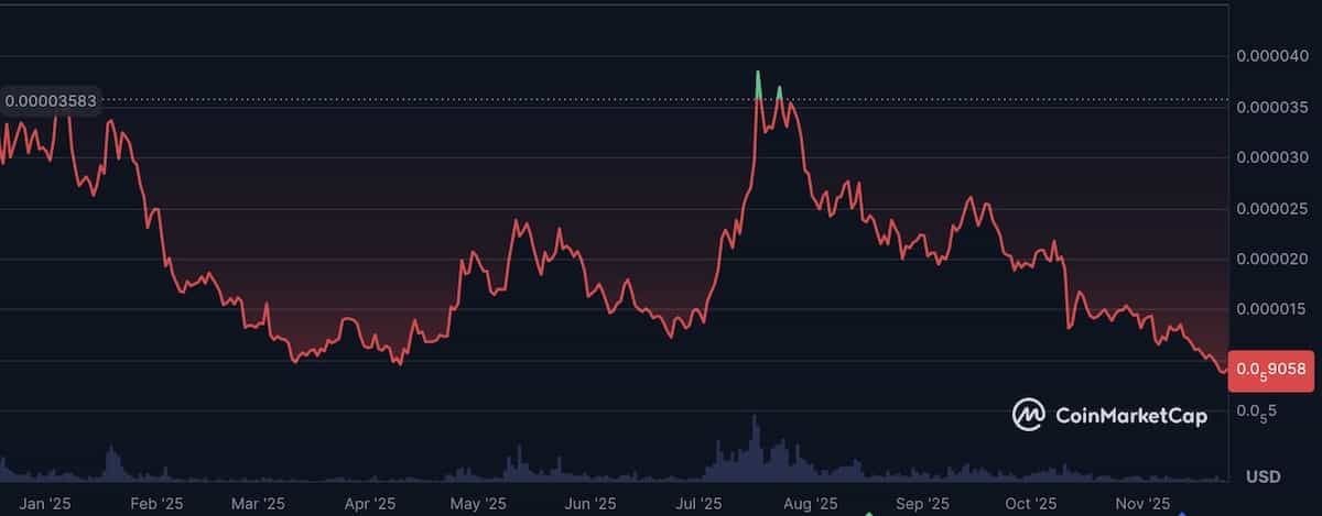 虽然在 8 月份曾短暂达到高点,但这是由于市场形势恶化所致,到 2025 年下半年,它已跌破 0.00001 美元。