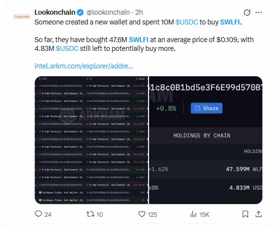 在链上追踪 器Lookonchain 重点介绍了一款进军 WLFI 的新钱包后,市场关注度显着提高。