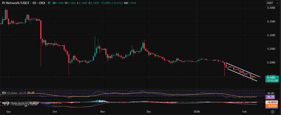 Pi Network 目前交易价格接近0.145 美元,日线图显示,在经历了长期的下跌趋势后,短期内形成了一个下降信道。