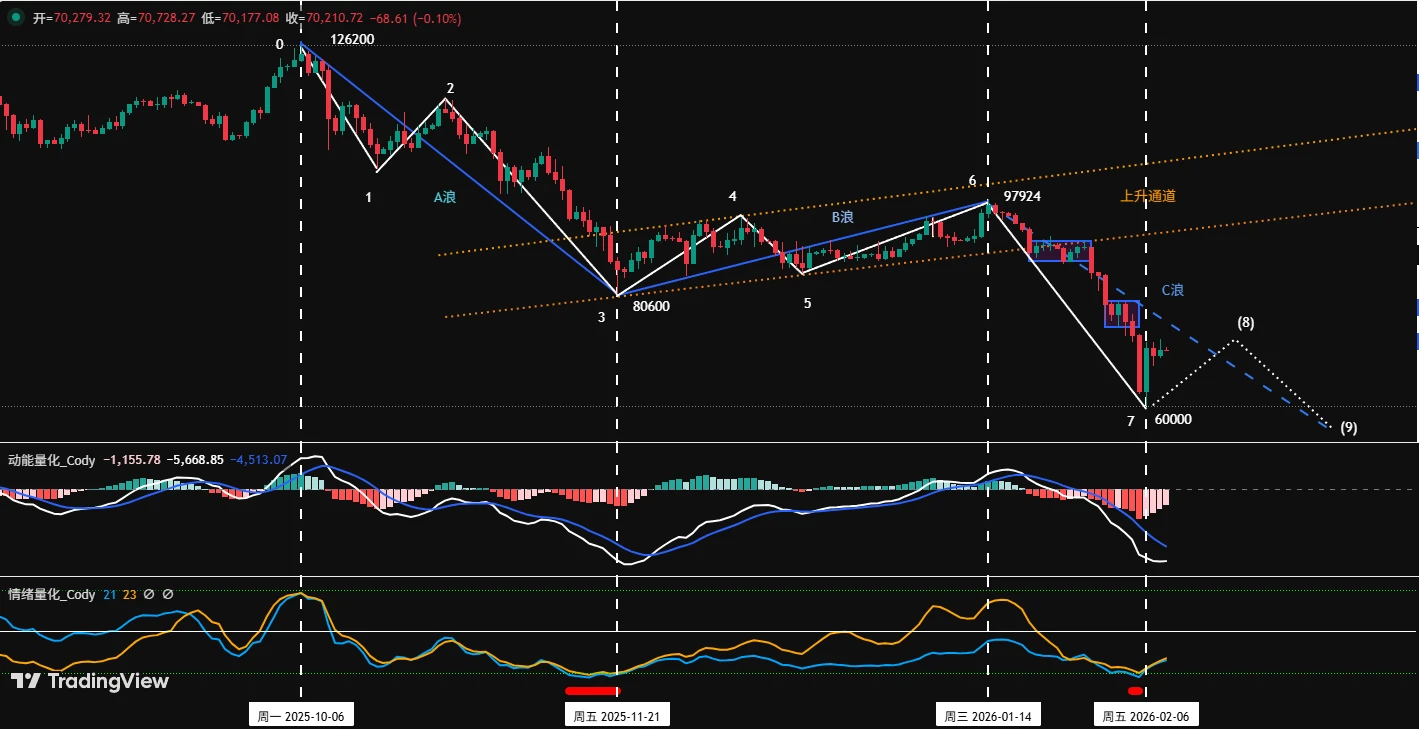 • 6-7 段(首轮驱动下跌),目标已完成:97,924 美元(2026-01-14)至 60,000 美元(2026-02-06),历时 23 天,最大跌幅 38.7%。(根据调整时间及跌幅判断,60,000 美元是 C 浪内部第一段调整低点的概率大)