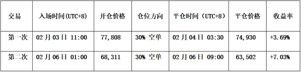 • 开仓:反抽69,000 美元压力遇阻叠加两个模型沽空共振信号,于68,311 美元建立 30%空头仓位。