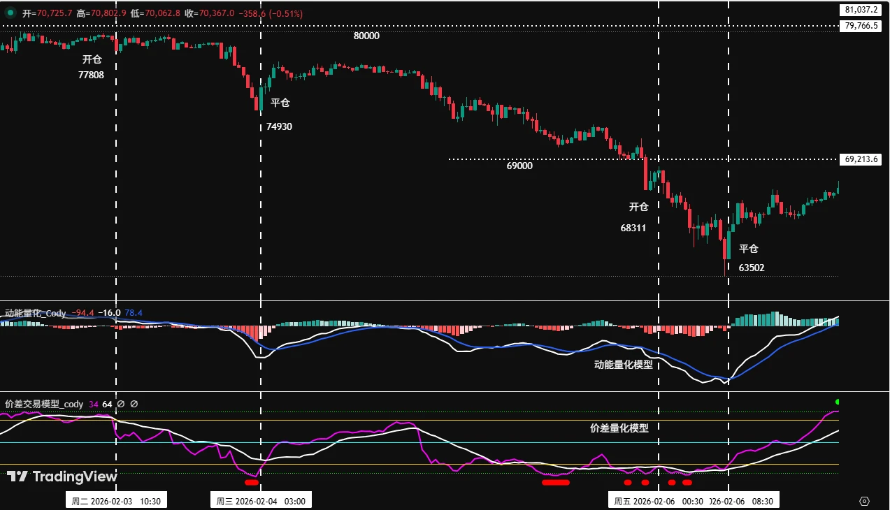 • 平仓:跌至 74,500 美元支撑位附近叠加价差模型底部信号(红点)及 K 线组合见底信号,与74,930 美元全部清仓。