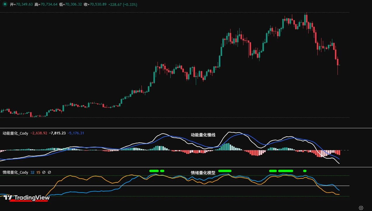 比特币日 K 线图:(动能量化模型+情绪量化模型)