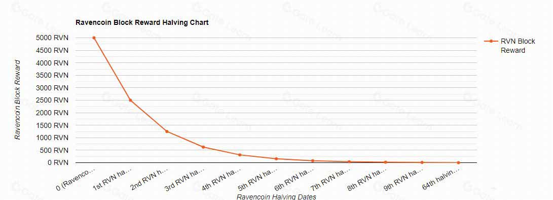 与比特币类似,Ravencoin 网络也实施了一个称为每 2,100,000 个区块进行减半的过程,从而确保能控制新代币释放进入流通。在2022年1月实施第一次减半之前,每个区块的挖矿奖励为5,000 RVN。减半后,奖励减少到每个区块2,500 RVN。