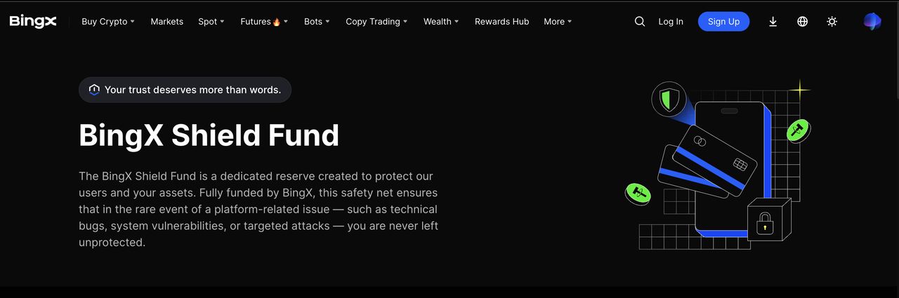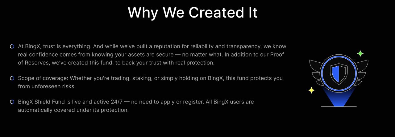 | BingX | 每月默克尔树 | 1.5亿美元盾牌基金加保险 | 98%以上 | 多个司法管辖区 | 2FA防钓鱼IP白名单AI监控 |