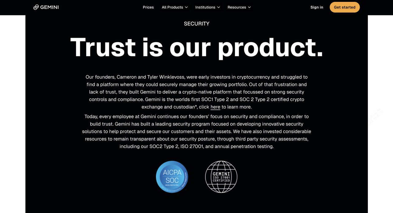 Gemini通过每月储备证明审计、通过Aon联合保险提供的2.5亿美元单用户保险覆盖、托管客户100%冷钱包存储、完全NYDFS BitLicense和机构级合规标准,保持卓越的安全文件。Gemini创建了领先的安全计划,专注于开发创新安全解决方案,帮助保护客户及其资产。该团队还投入大量资源保持安全态势的透明度,通过第三方安全评估,包括SOC2 Type 2、ISO 27001和年度渗透测试。