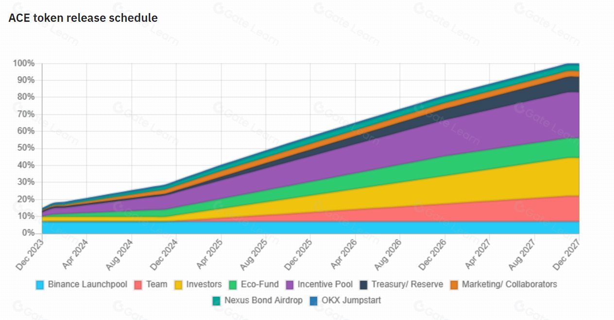 ACE 的总供应量为 1.47 亿个,为了防止不可预见的因素和市场操纵,前 60 天仅释放 147 万个。在总代币供应量中,15% 将分配给团队,22.5% 将分配给投资者,11.6% 将用作生态系统基金,27% 将用于激励池,9% 将用于国库,3.5% 将用于营销。初始流通供应量为 21,969,520 个 ACE,占总供应量的 14.95%。
