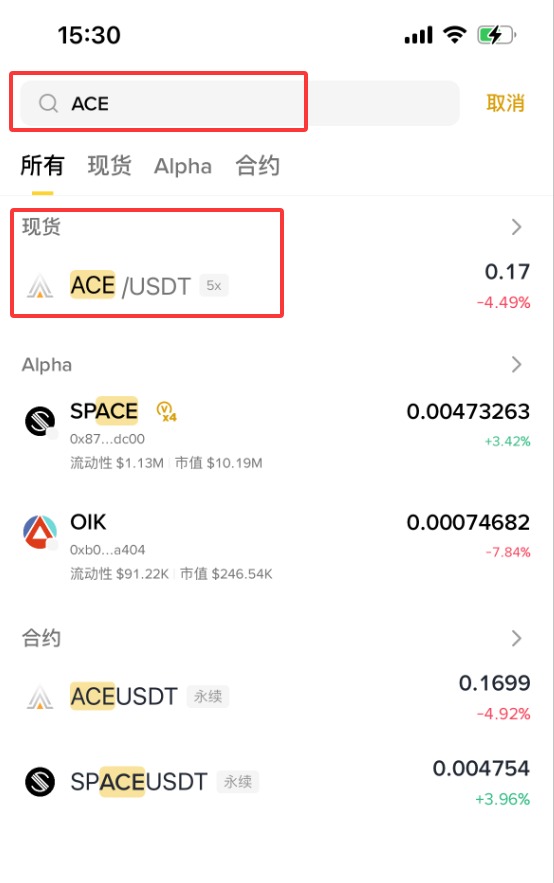 3、输入【ACE】,这时下拉会显示【现货】【ACE/ USDT】,点击【ACE/ USDT】。(作为新手,不建议做合约,所以这里就不演示合约购买方式了。)