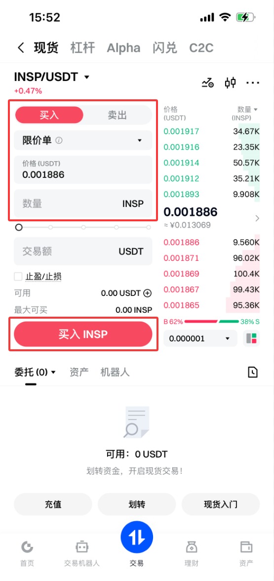 3.点击INSP/USDT进入详情页面,就可以看到该币种的交易信息以及市场信息,点击下方的买入按钮