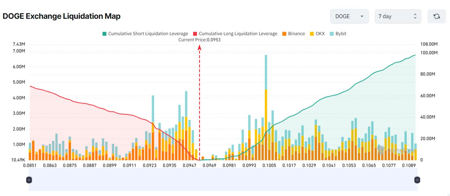 狗狗币的价格已跌破0.10美元心理关口,与2024年的低点持平。然而,其7天清算地图显示,如果价格反弹至0.109美元,可能引发约9,800万美元的空头清算。