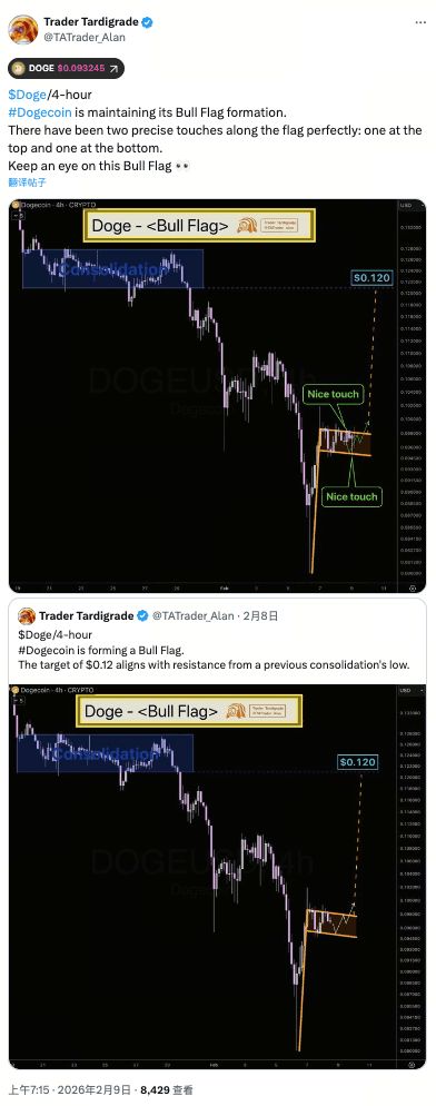 技术分析为这种反弹提供了可能性。交易员Trader Tardigrade指出,狗狗币可能正在形成 “牛旗形态” ,这是一种看涨的延续形态。此形态若确认突破,价格可能向0.12美元迈进。