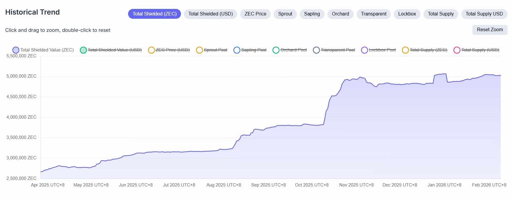 以太坊联合创始人Vitalik Buterin公开向致力于Zcash开发的Shielded Labs捐款,并强调 “隐私是区块链内核基础设施” 。来自zkp.baby的数据显示,尽管价格暴跌,但仍有超过500万枚ZEC被锁定在隐私池中,表明内核用户对技术的信仰依然坚定。
