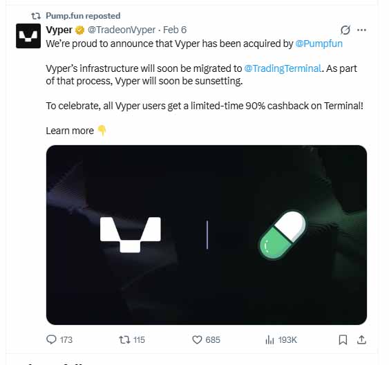 Pump.fun近日宣布收购交易终端 Vyper,迁移工作将于 2 月开始。