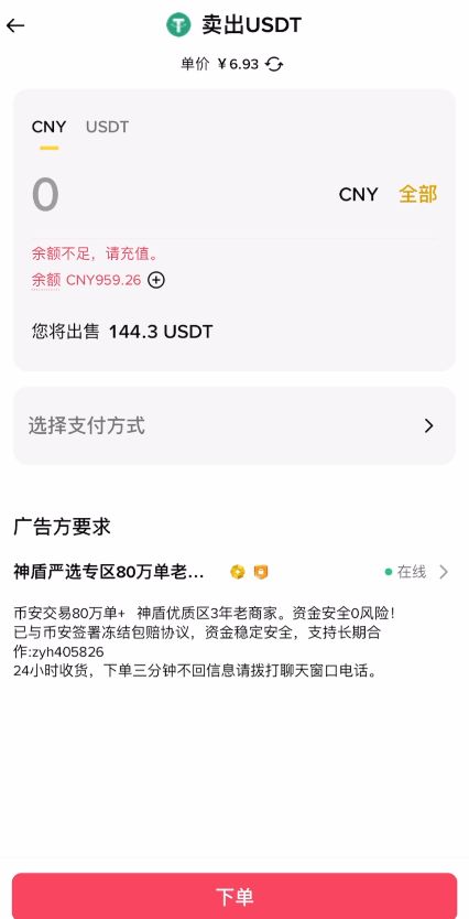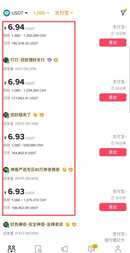 这样下面就出现了符合我们条件的商家,首先我们可以看到报价最高的是6.94,其次是6.93,我们就忽略这些6.94的商家,从报价次之的6.93的这些商家里面去选择,因为高价收U是有一定的风险的。