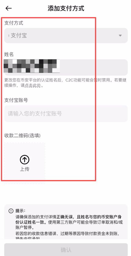 支付方式我们就选择“支付宝”,下方的姓名是自动实名的。接下来就需要我们输入我们的支付宝账号以及我们的收款二维码,点击确认后,把它添加上。