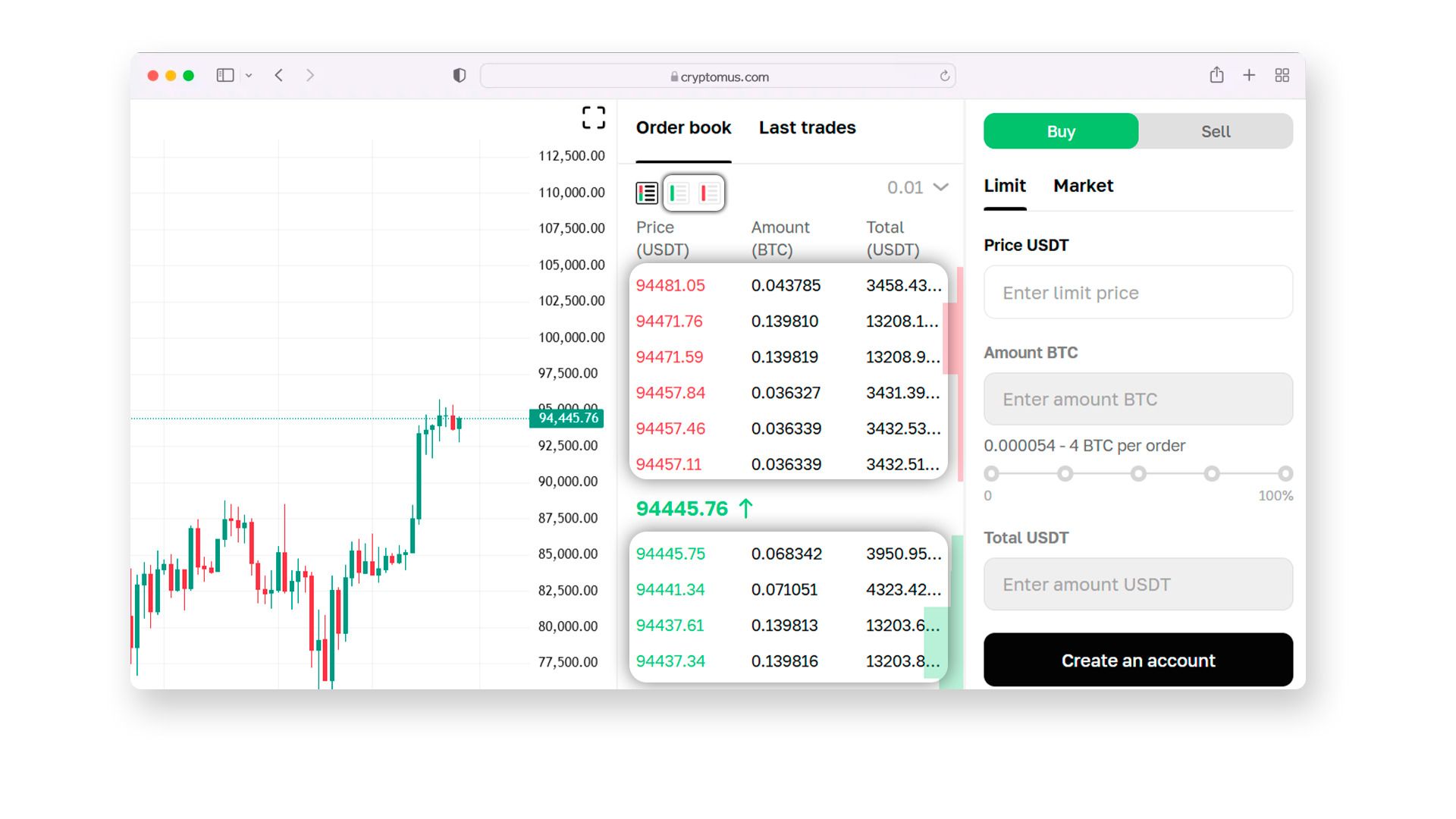 几乎每个加密货币交易所都有订单簿。例如,在Cryptomus的现货交易模式中,订单簿通过颜色分为两部分:卖单(ask)在顶部以红色突出显示,买单(bid)则在底部以绿色显示。你还可以根据自己的需求选择仅查看买单或卖单。