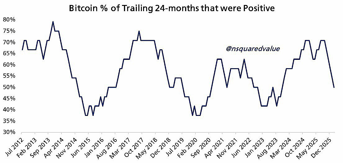 “过去24个月中,有50%的时间呈上涨态势。这意味着,10个月后比特币上涨的概率高达88%。”他在X平台上报告称。