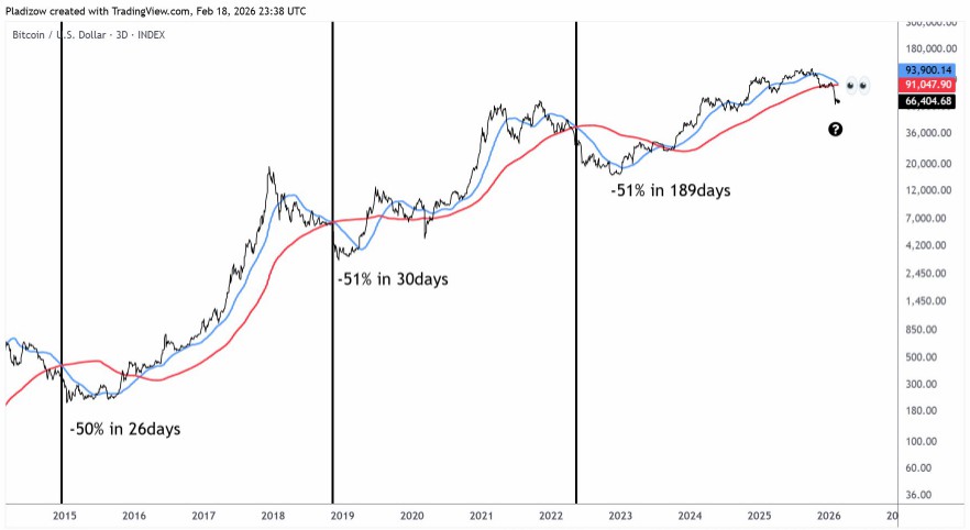 比特币三日图上的死亡交叉。来源:Nunya Bizniz/X