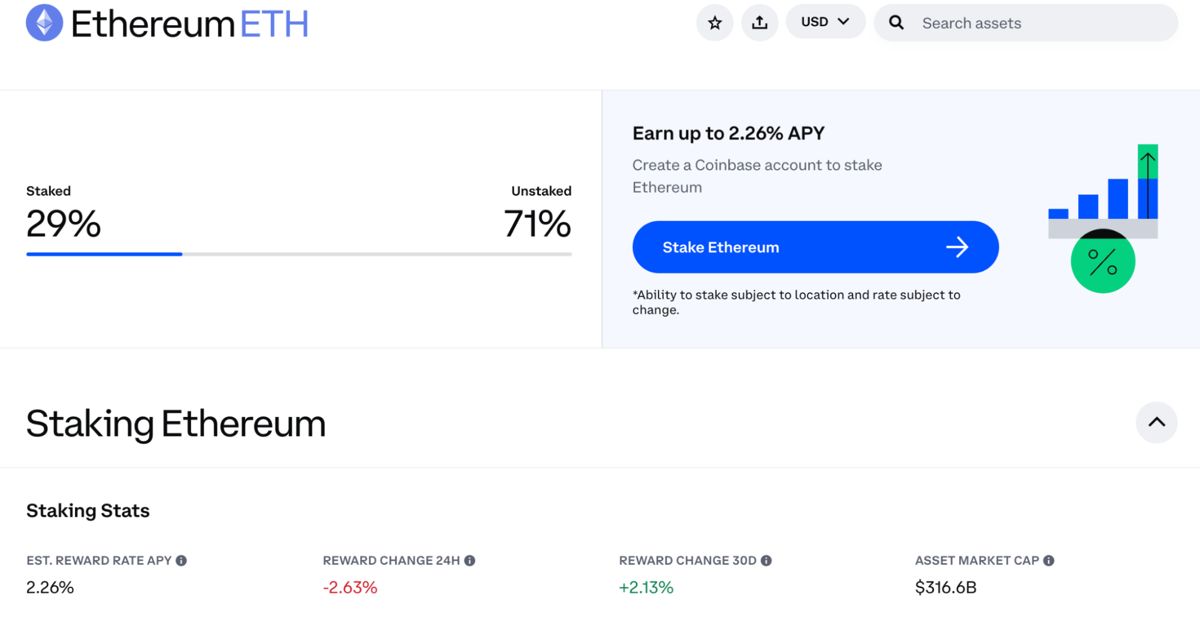 从官方数据看 Coinbase 上 ETH质押APR在2.26%,质押代币数3441.2万个,质押占比28.59%。