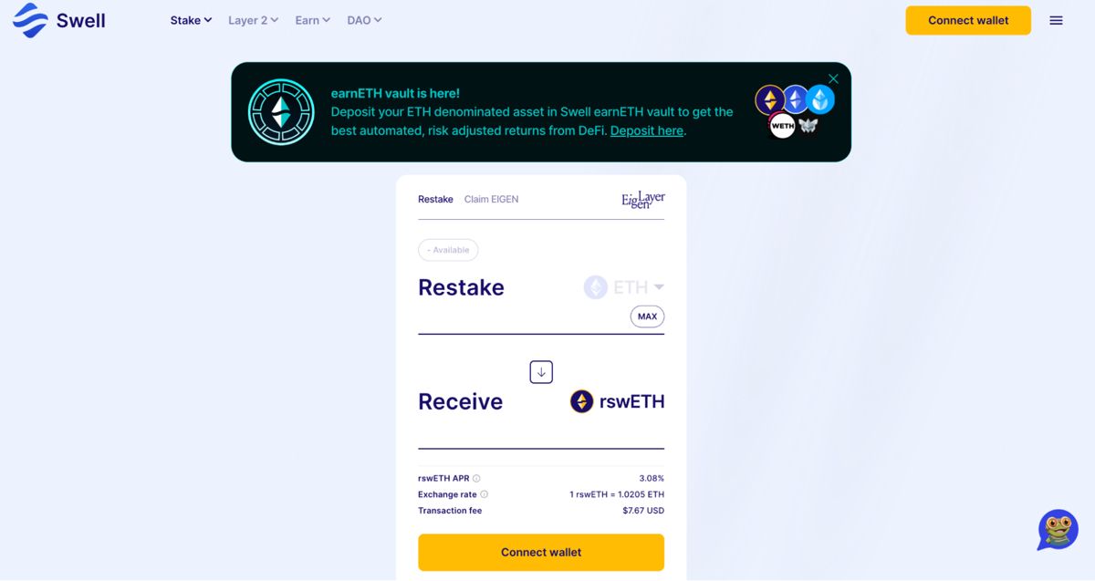 Swell Network 是一个流动性质押协议,为用户提供流动性质押和再质押体验,简化用户对 DeFi 的访问路径,同时确保以太坊和再质押服务的未来。用户只需要链接钱包质押ETH,获得 $swETH 积累空投积分,并开始赚取收益。