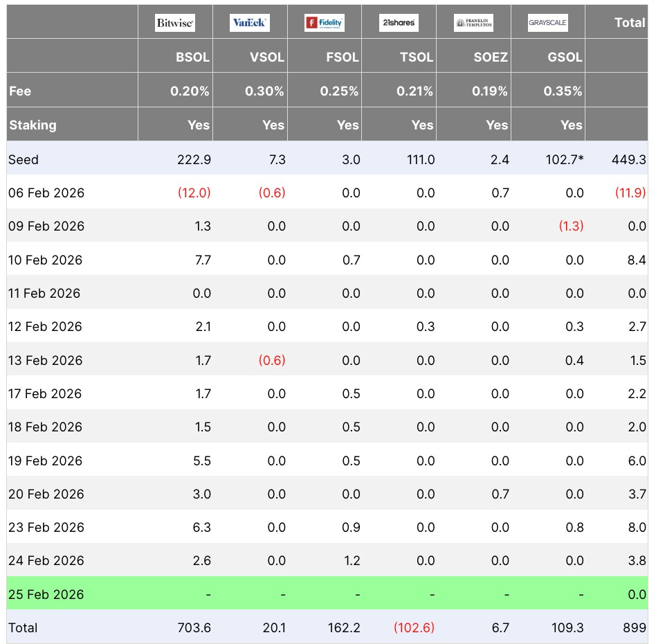 买家同样为美国本土的现货Solana ETFs,自2月9日以来已录得4000万美元的净流入。