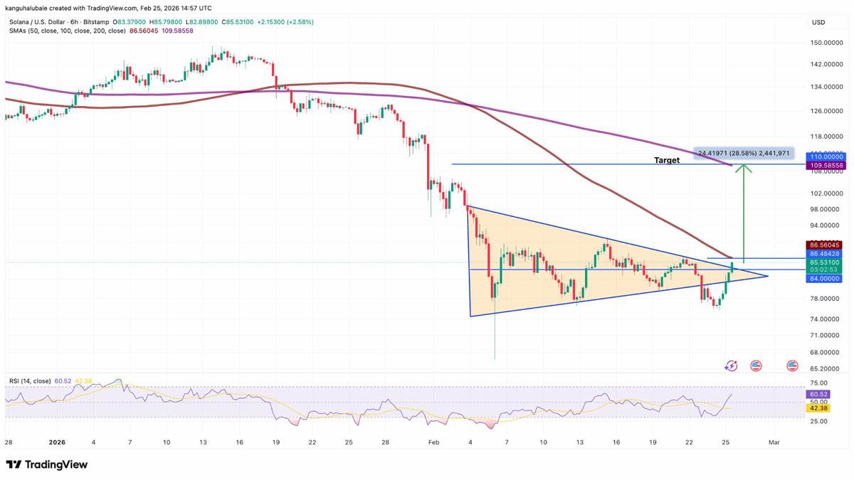 来自TradingView的数据显示,SOL价格已在6小时周期上突破了一个对称三角形,如下图所示。