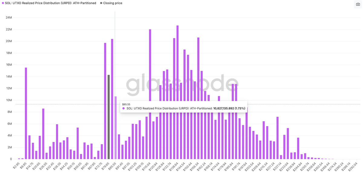Glassnode针对Solana的已实现价格分布数据显示,85美元上方的历史买入活动有限,这表明多头可能突破这一阻力位。