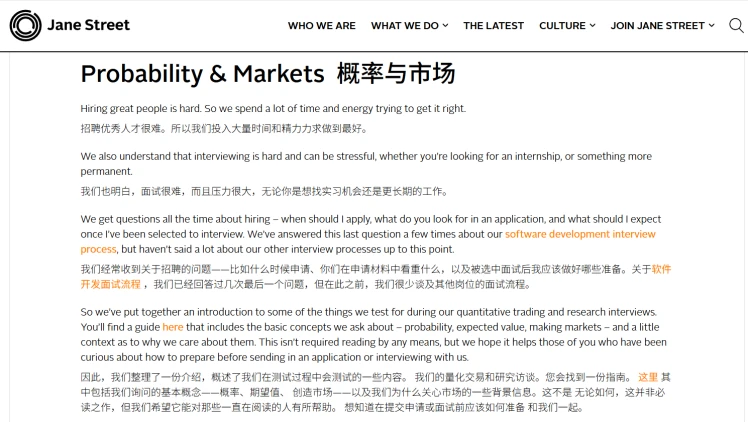 “面试过程出了名的难”。候选人需要在压力下解答概率题、博弈论题、期望值计算,考察的是底层的逻辑能力,而非行业知识。据公司自述,只有「极小比例」的申请者会被邀请进入面试环节。