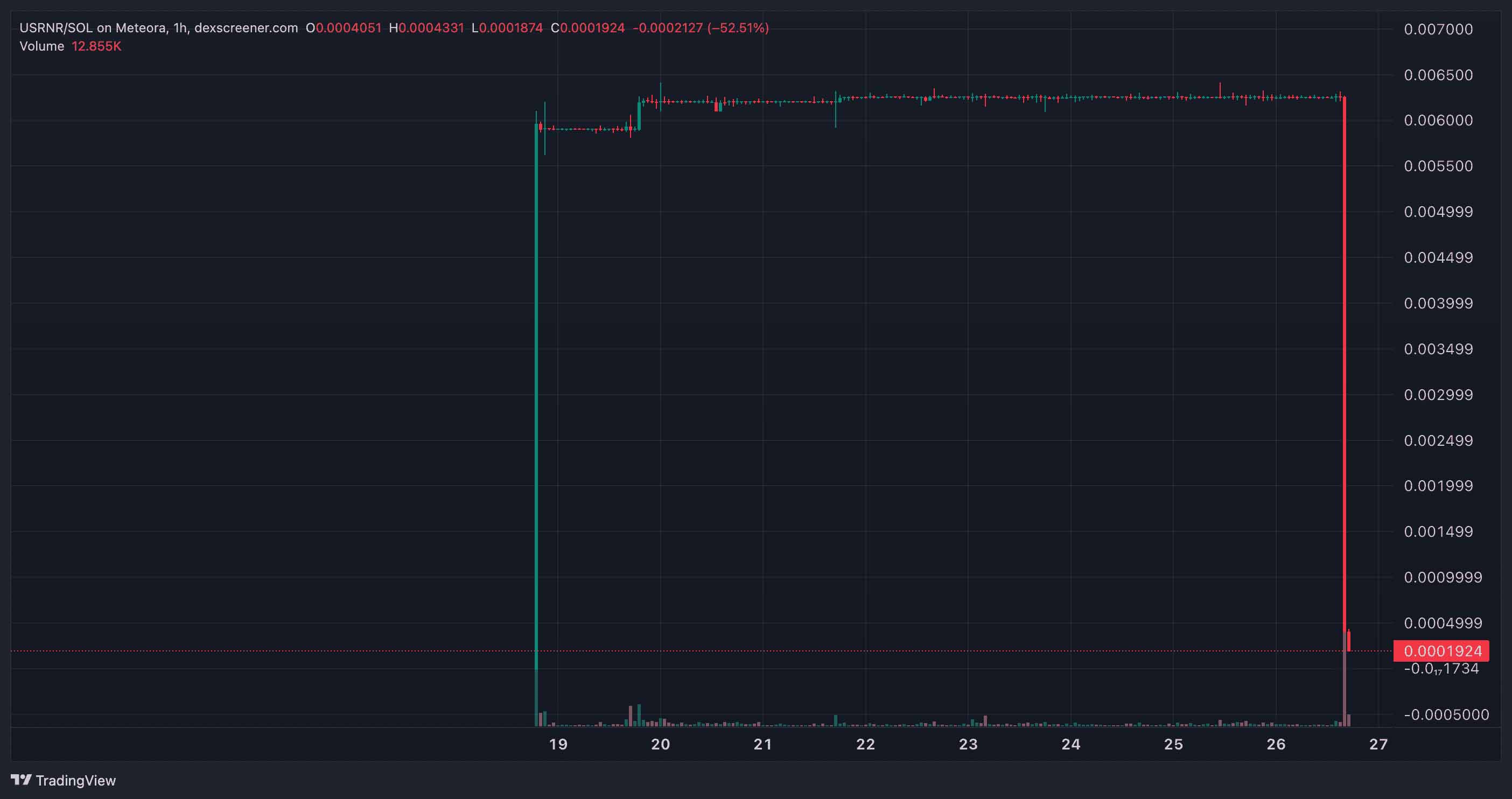 USNRN 的供应模型非常简单。其固定最大供应量为 10 亿枚代币,并且似乎全部供应都已铸造完成。由于没有持续的通胀机制,新代币不会不断产生。交易活动主要在去中心化的流动性池中进行,USNRN 与 SOL 或稳定币配对交易。因此,代币价格由流动性深度和市场需求决定。如果买盘相对于可用流动性增加,价格就会上涨。如果持有者在流动性不足的情况下抛售,价格可能会急剧下跌。这种结构使得 USNRN 对市场情绪变化和投机动能高度敏感,而非基本经济因素。