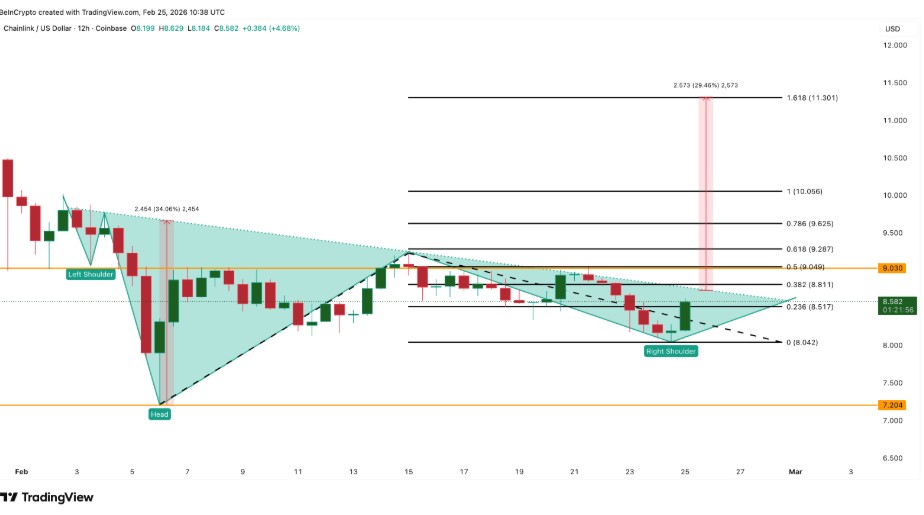 在12小时的时间框架内,LINK正在形成一个反向头肩形态。这一结构通常在颈线被突破时会带来牛市的暗示。