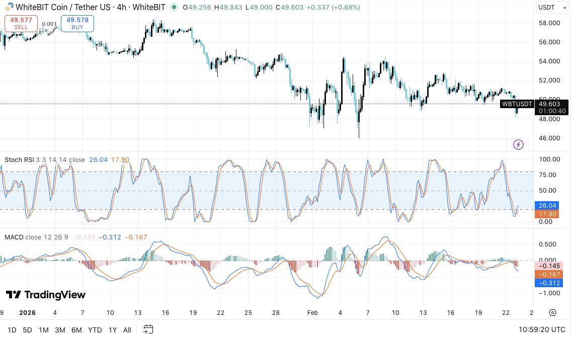 在4小时图上,WBT仍低于主要指数移动平均线。价格在20、50、100和200周期指数移动平均线下方交易。这种排列证实了持续的短期看跌压力。