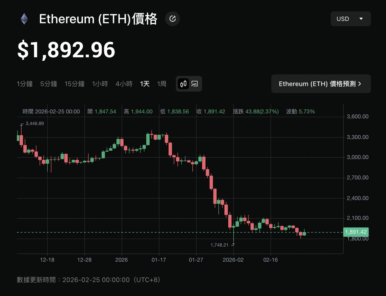 截至 2026 年 2 月,以太币价格 (ETH) 约落在 1,850 至 1,950 美元区间。相较于 2025 年 8 月创下约 4,950 美元的历史高点,目前仍处于深度修正与整理阶段。不过,多数机构分析师普遍认为,这段低位盘整正是以太坊网络基本面持续深化的蓄积期。随着 Pectra 协议升级落地、以太坊现货 ETF 资金持续流入,以及机构投资人加速增持,以太坊的长期结构仍展现出相对稳健的发展趋势。