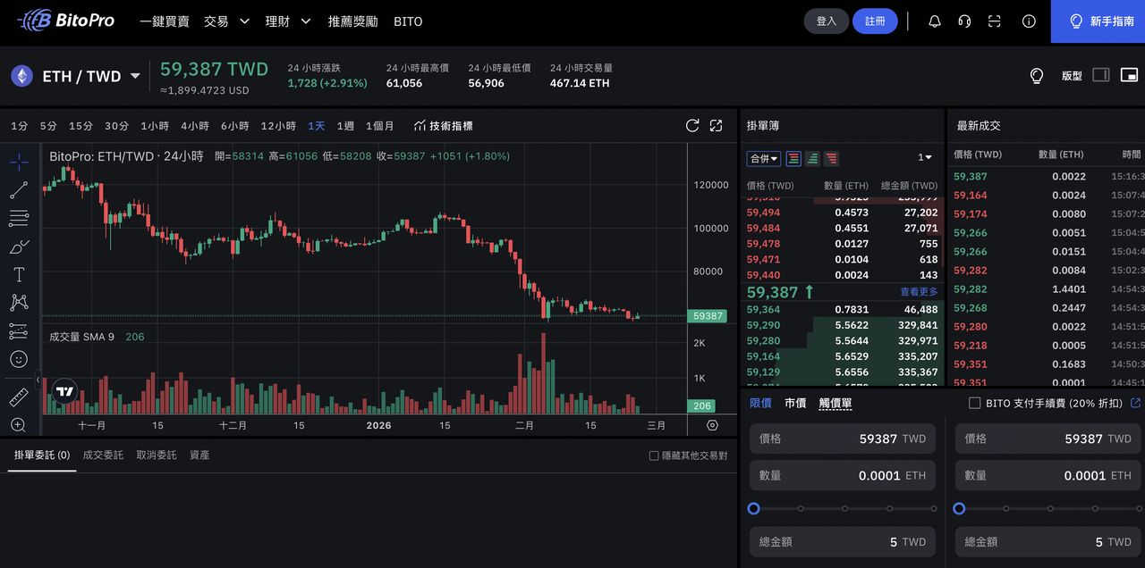 BitoPro(币托)是台湾主要加密货币交易所之一,提供 ETH/TWD 现货交易对,让用户可直接以新台币购买以太币。现货手续费约落在 0.1%–0.2% 区间,属于在地市场常见水准。