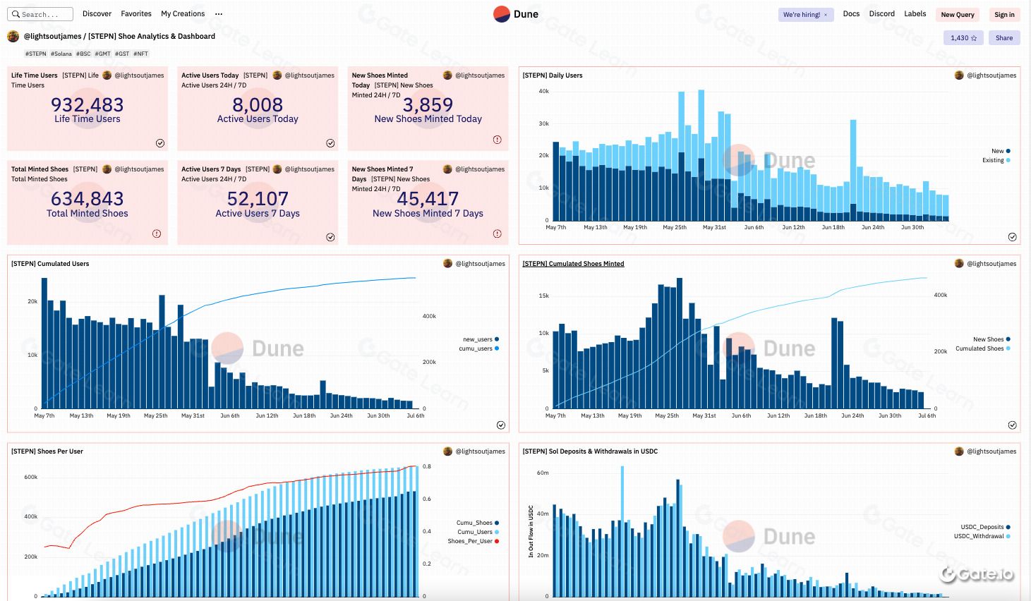 下面以前文提到的 STEPN 为例,像是 STEPN 每天增加多少用户,与固定时间段的价格走势图,皆可以使用 Dune 查询并绘制成图表。