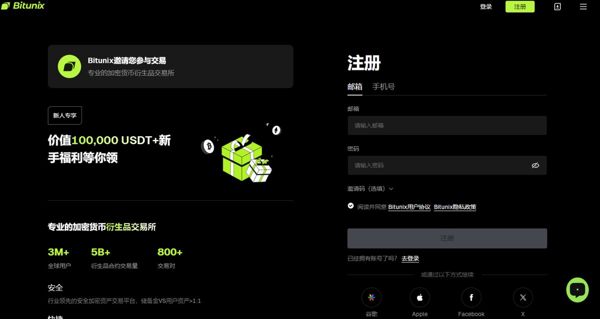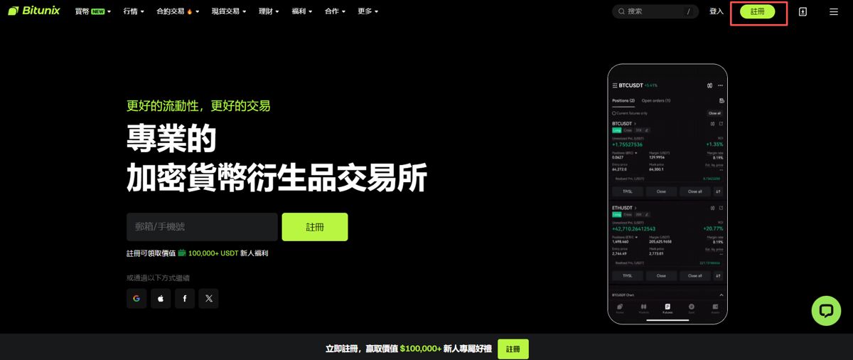1. 打开Bitunix 网站,点击右上角「注册」按钮,进入注册页面。