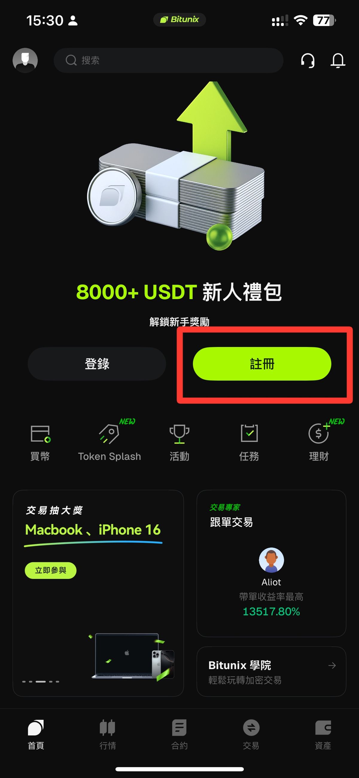 1、打开Bitunix App,点击页面中间的【注册】,进入注册页面。