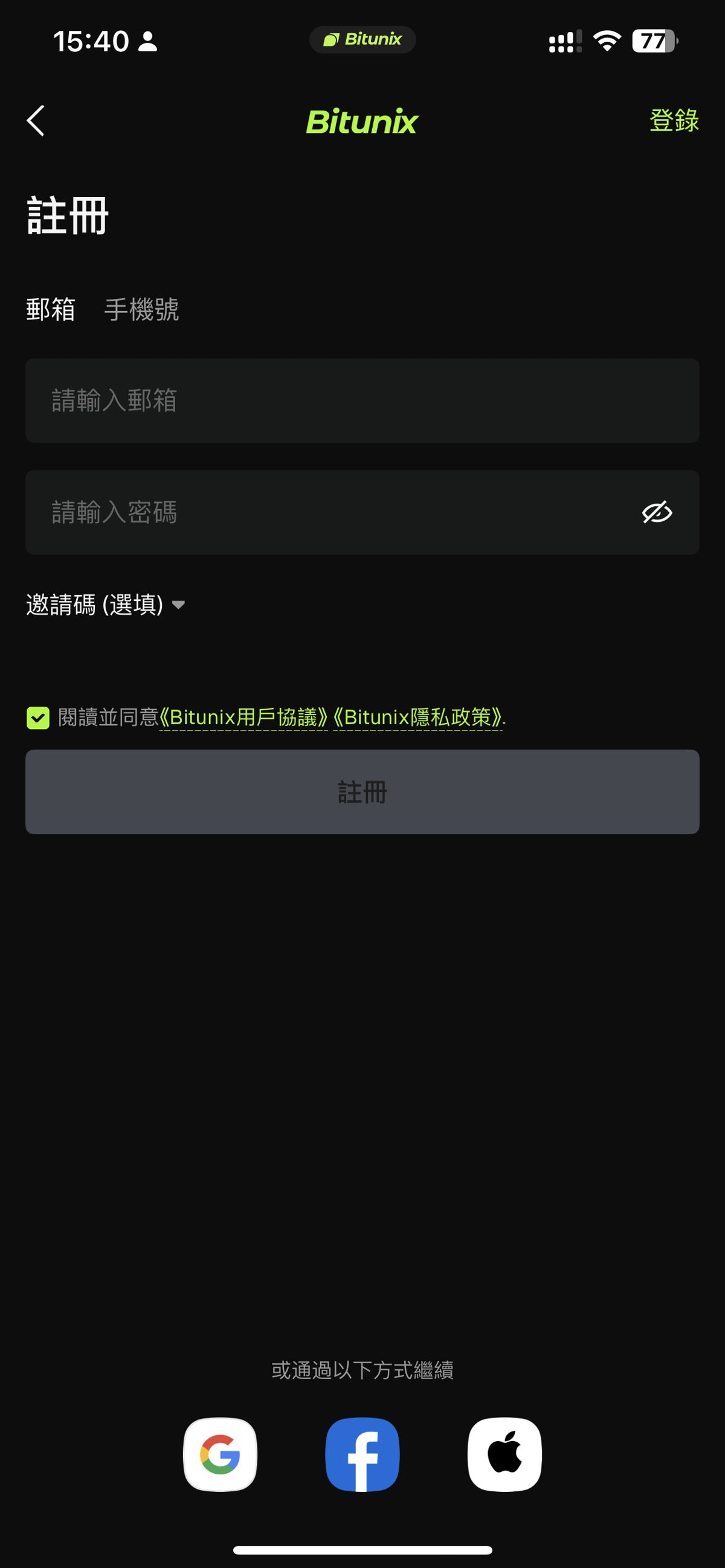 2、根据提示填写邮箱、密码、勾选已阅读并同意《Bitunix用户协议》和《Bitunix隐私政策》,(手机号注册需要选择对应区号)点击【注册】即可。