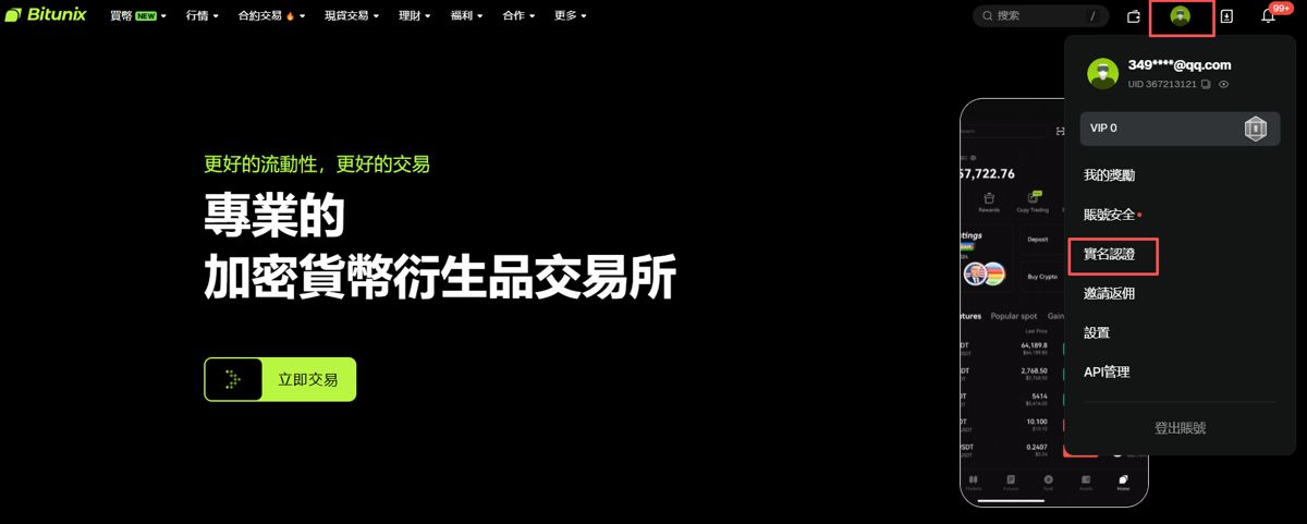 1、打开Bitunix官网,登录Bitunix个人账户,在右上方个人头像下弹出的内容中选择【实名认证】。