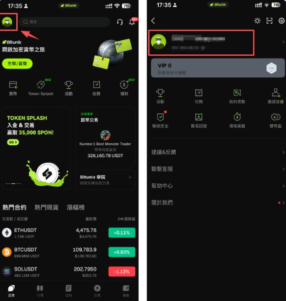 1、开启Bitunix App,登入Bitunix 个人帐户,依序点选【左上方头像】--【头像区域】--【实名认证】
