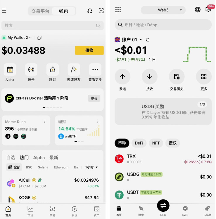 然后我们再来看一下,最近比较火的钱包。币安的Web3钱包和欧易的Web3钱包,他们的页面对比。