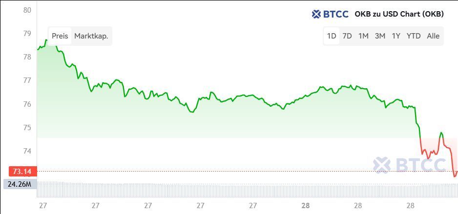 OKB (OKB)目前的交易价格为76.7268 美元,24 小时内下跌了 2.18%。