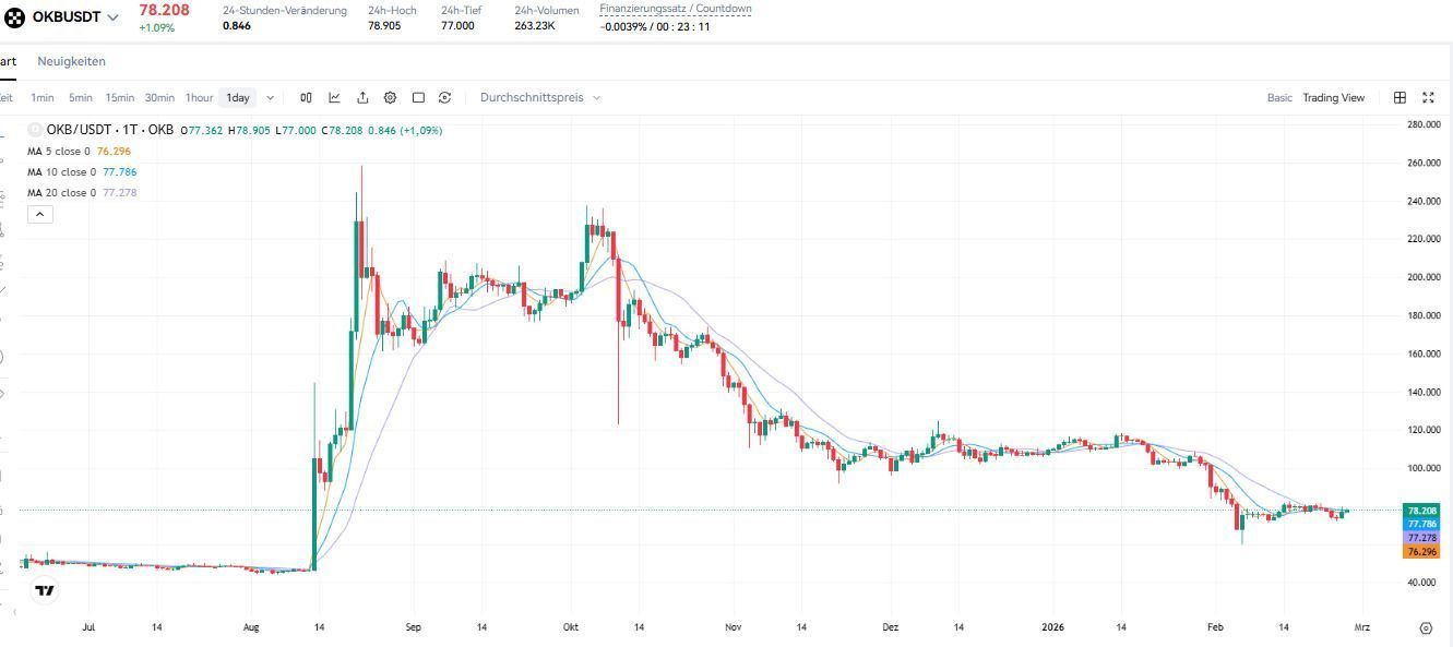 从技术角度来看,OKB 目前在 60 美元至 100 美元之间的宽幅盘整区间内交易。价格低于短期移动平均线(EMA-10 和 EMA-20),而中期平均线(如 EMA-30 和 EMA-50)继续提供支撑。