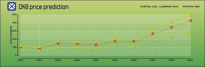OKB的长期预测涵盖2027年至2050年,并展示了其股价的年度走势。预测中给出了每年的三个数值:预计年度最低价、年度平均价格和年度最高价。