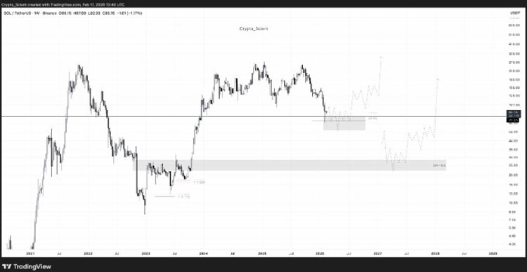 加密货币交易员 Scient指出两个可能决定潜在底部的宏观区域。第一个是 60 美元至 70 美元的 0.75 斐波那契回撤位,这一水平与更大上涨趋势中的深度回调相关。