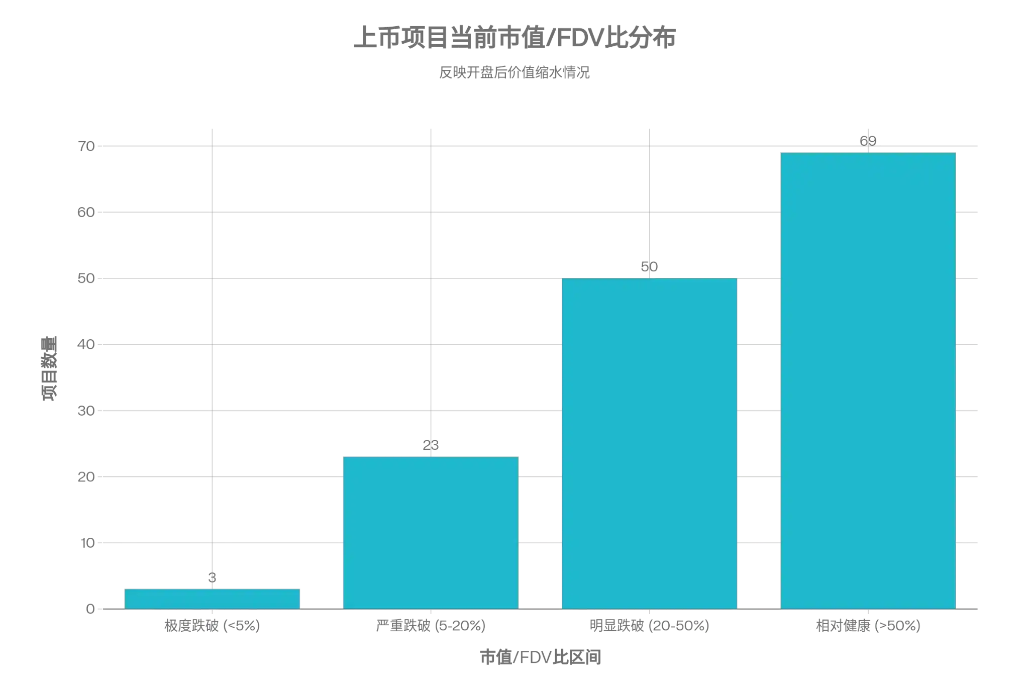 市值与FDV的大幅背离,在高FDV发行的项目中较为普遍,这也是本轮周期加密市场的共性现象。在152个可在交易所交易的项目中,当前市值低于FDV 50%的项目共76个(50%),市值/FDV低于20%的项目26个(17.1%)。