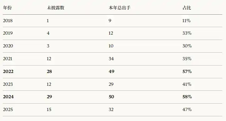 - 早期(2018–2021年)未披露率维持在 11%–35% 之间;
